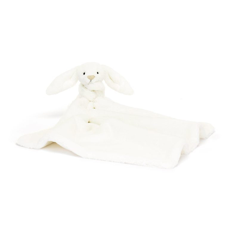 Bashful Luxe Bunny Luna Soother is irresistible to touch in our softest pure white fur. A lop-eared bunny with stitched eyes and gold thread nose holds our finest soother.