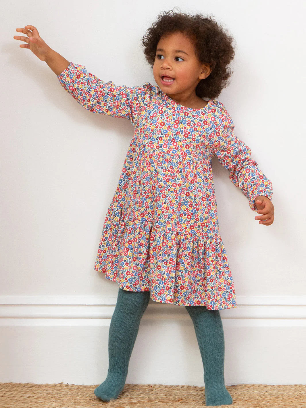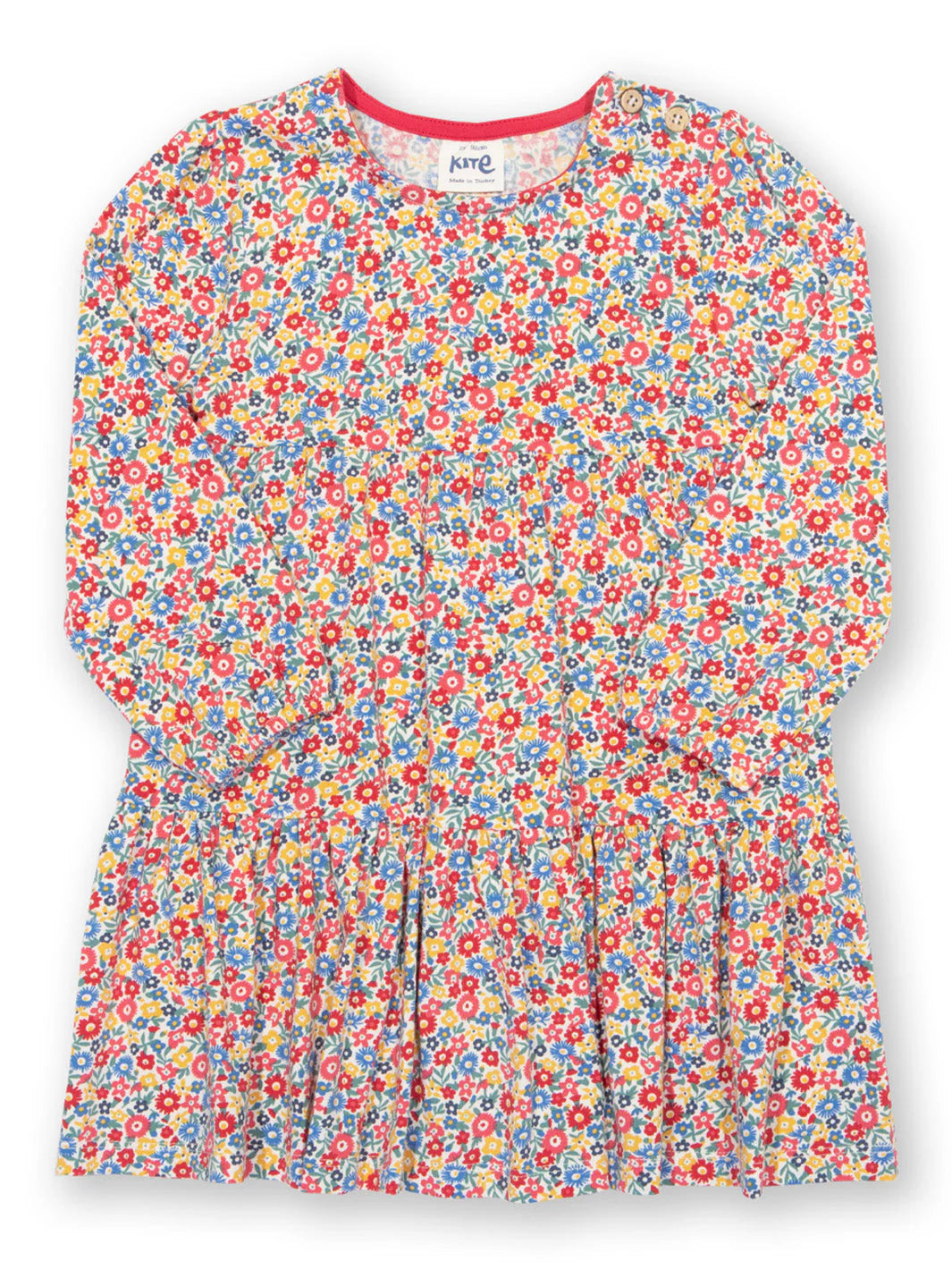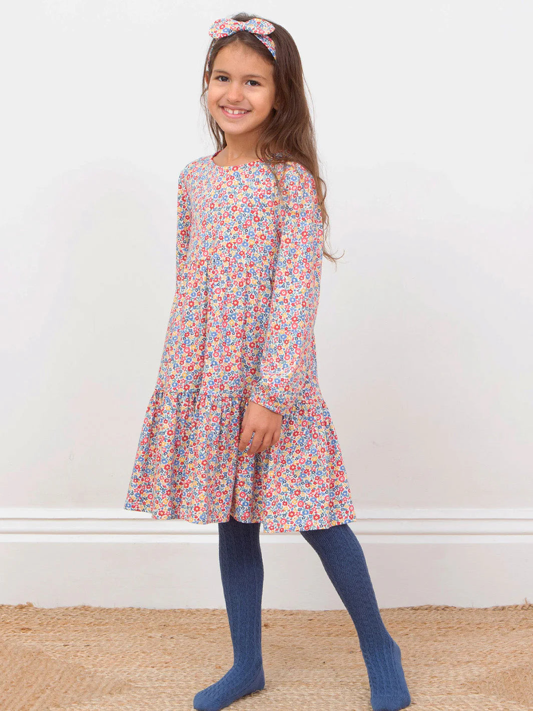 Spin away in this fab dress with a tiered, full skirt. Our Ditsy tales print is inspired by the enchanting world of storytelling, filled with magical, blooming gardens and vibrant flowers! Made from our fantastic stretch jersey which delivers comfort and durability. You can find this Kite print across our range for lots of coordinating options.