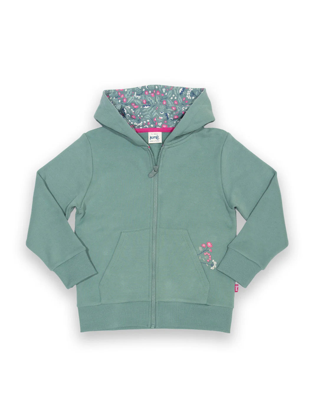 The perfect layer for any adventure and so easy to pop on and off! In beautiful spruce green, this hoody features our forest belle print in the hood and matching embroidered flowers peeking from the pocket, it's brimming with special details. Pair with our forest belle leggings for a cute and comfy look. Made from 100% organic cotton.