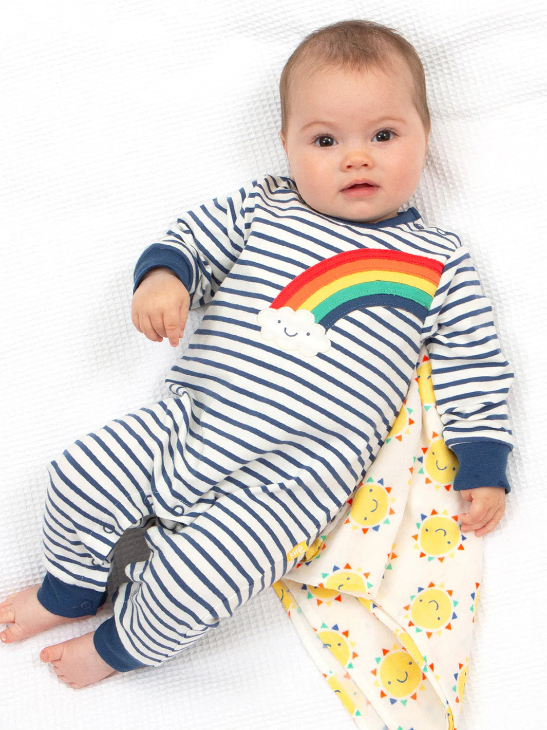 Our stripy organic cotton romper, with a fun smiley rainbow applique, makes the cutest outfit for little boys and girls alike. Designed for sleepy time and playtime, this option offers comfort day and night. Made from hard-wearing and durable stretch cotton jersey this little all-in-one is bound to bring a smile to everyone's face!