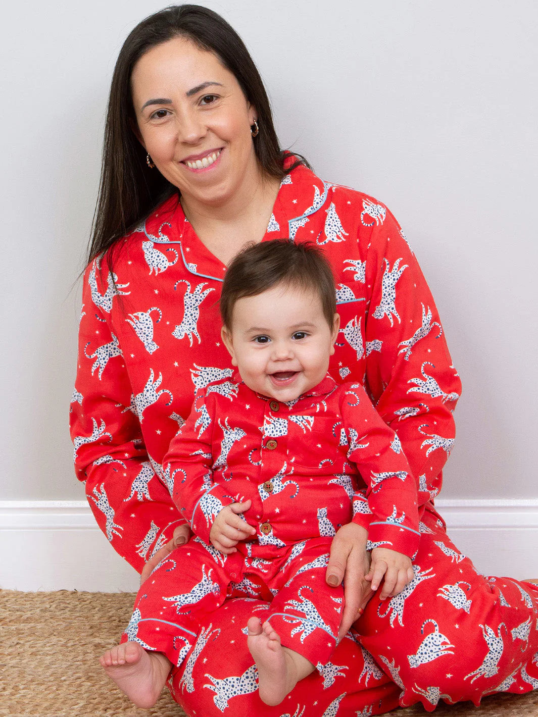 Our wonderful snow leopard romper made from soft organic cotton is definitely a must-have this winter. Featuring a popper crotch opening and coconut buttons to the front to make dressing easy and quick. Designed for sleepy time and playtime, this outfit offers comfort day and night. Find matching styles for older siblings and Mumma too, for the finest family look.