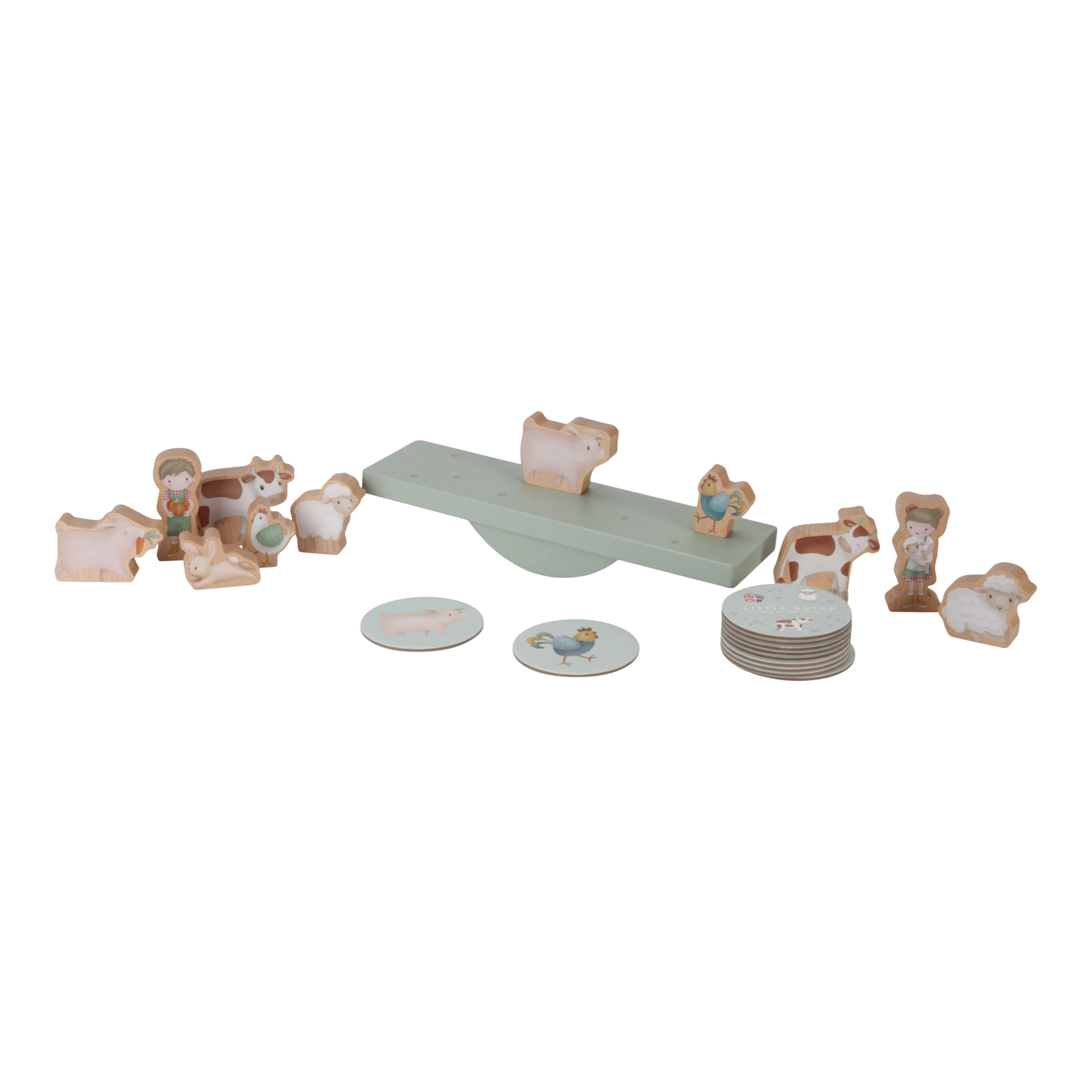 How many figures can you balance? Turn over a card and place the figure that matches your card on the meadow. Be careful not to wobble the balance too much, or the figures will fall off! This balancing game is fun to play alone, but also with the whole family. Balancing improves your child's hand-eye coordination and fine motor skills. The game includes 11 round cards, 1 balance, various animals and Jim and Rosa.