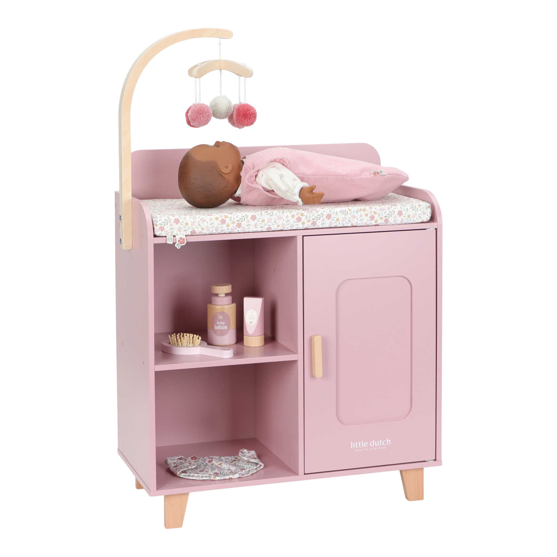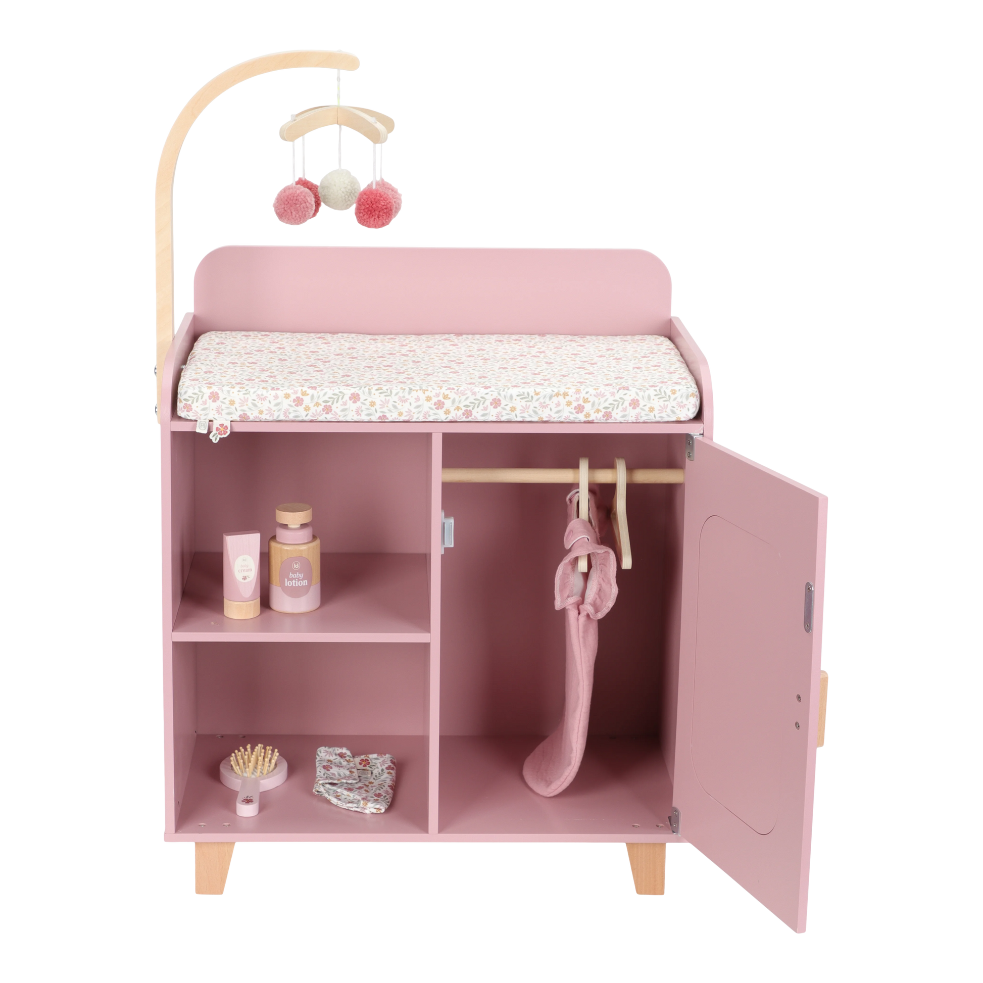 This beautiful doll changing table offers everything you need to lovingly care for your doll. The set includes a mobile, a wonderfully soft changing mat with a dreamy design, and various wooden care accessories. Additionally, the changing table comes with a diaper, a sleeping bag, and adorable clothes hangers to neatly store your doll's outfits. The cabinet provides extra storage space for all essentials, ensuring your doll is always well cared for.