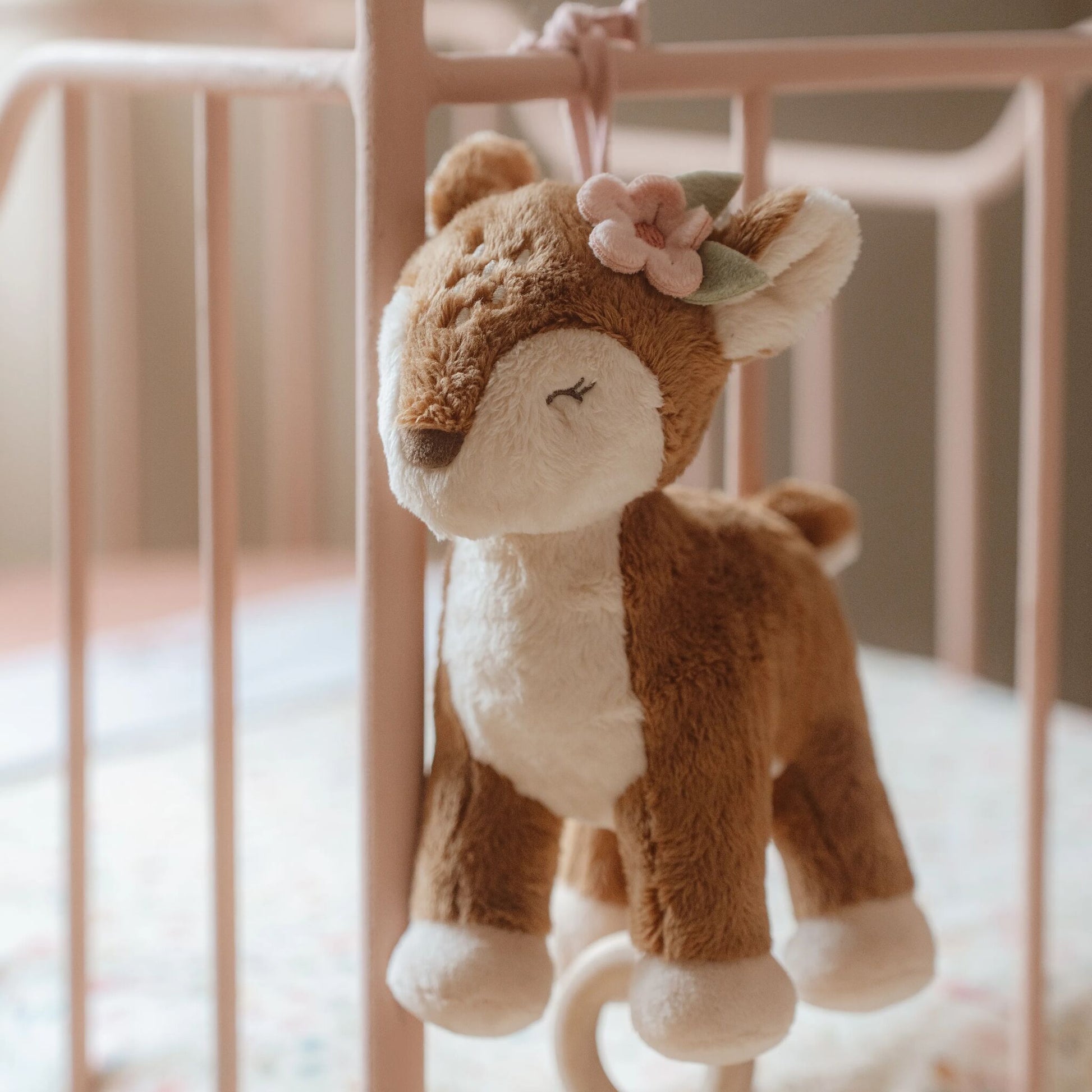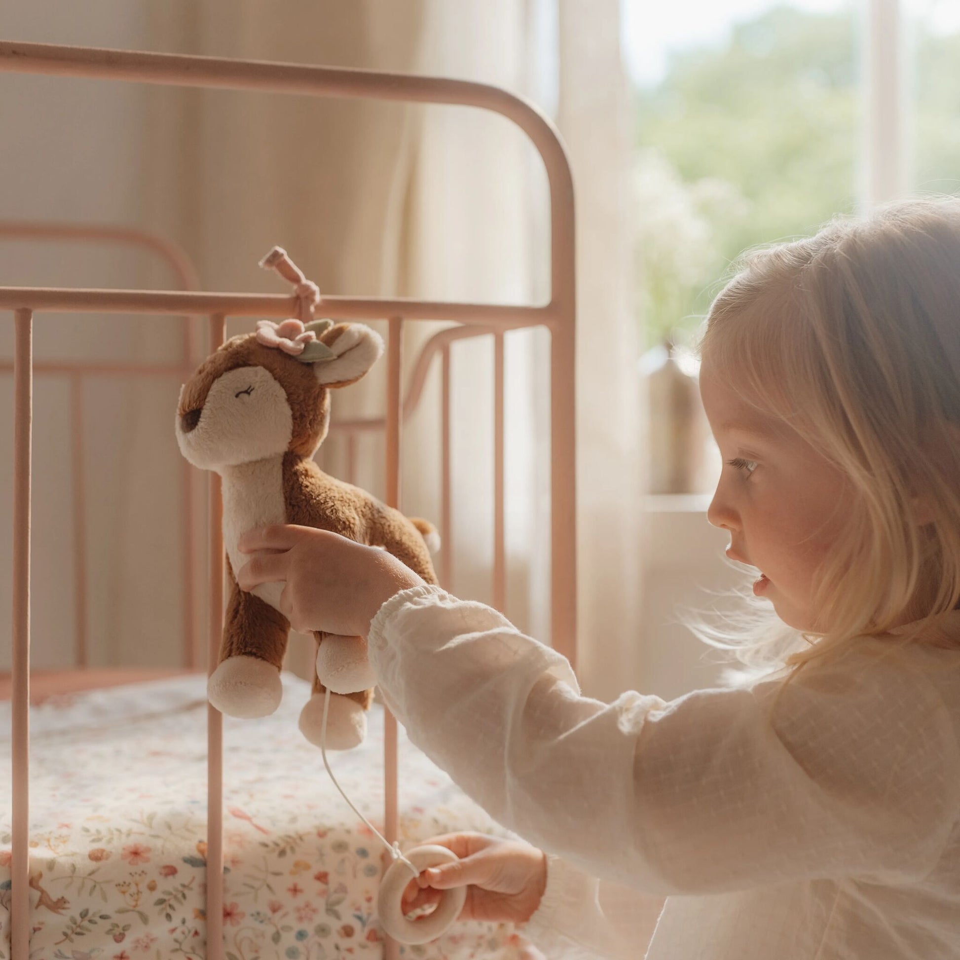 Sweet dreams! This sleeping deer will guide you to a dreamland filled with wonder and imagination. Enhance bedtime routines with the enchanting melodies from this playful music box. Pull down the wooden ring, and the soothing lullaby starts to play as your little one wanders off to sleep. A beautiful gift and a delightful addition to the nursery décor.