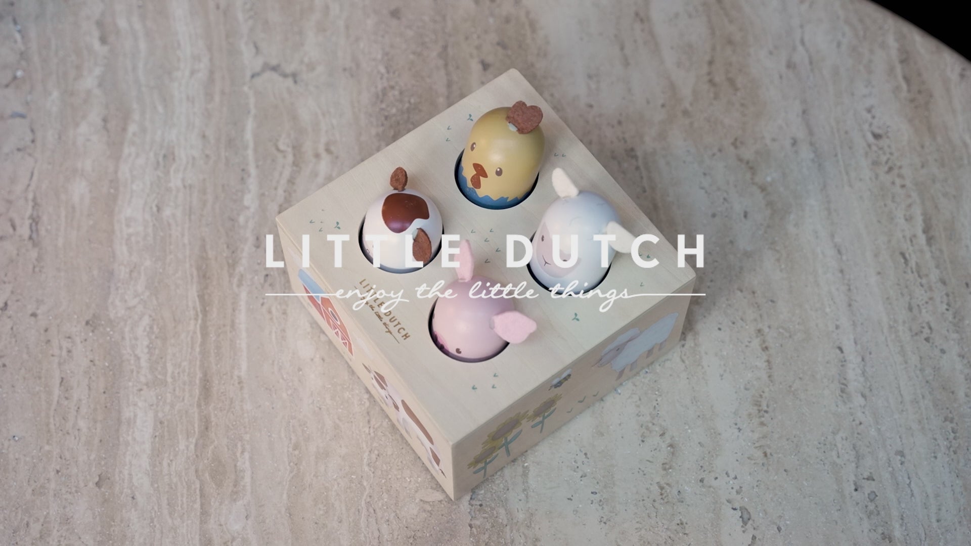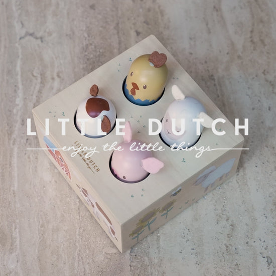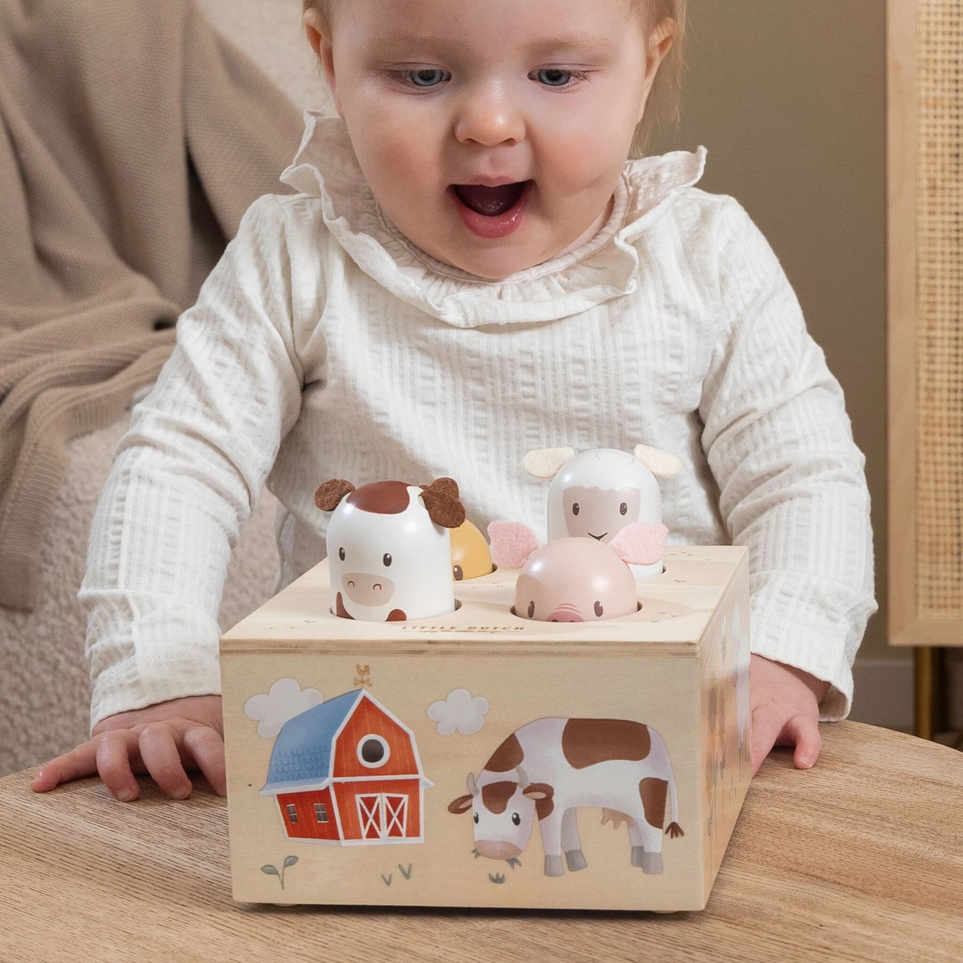 What’s poppin', little farmer?! These four farm animals are ready to play. With a gentle push, one animal pops in, and the other one pops out. Discover all the animals and match their sounds: the soft moo of the cow, the gentle baa of the sheep, the oink of the pig, and the cluck of the chicken. The sturdy wooden box of this interactive pop-up toy is adorned with friendly illustrations of Little Farm, designed to captivate the imagination of your little one. The encouraging animal sounds and the fun pop-up movements of the animal heads provide great entertainment and will help enhance cognitive abilities in a playful manner.