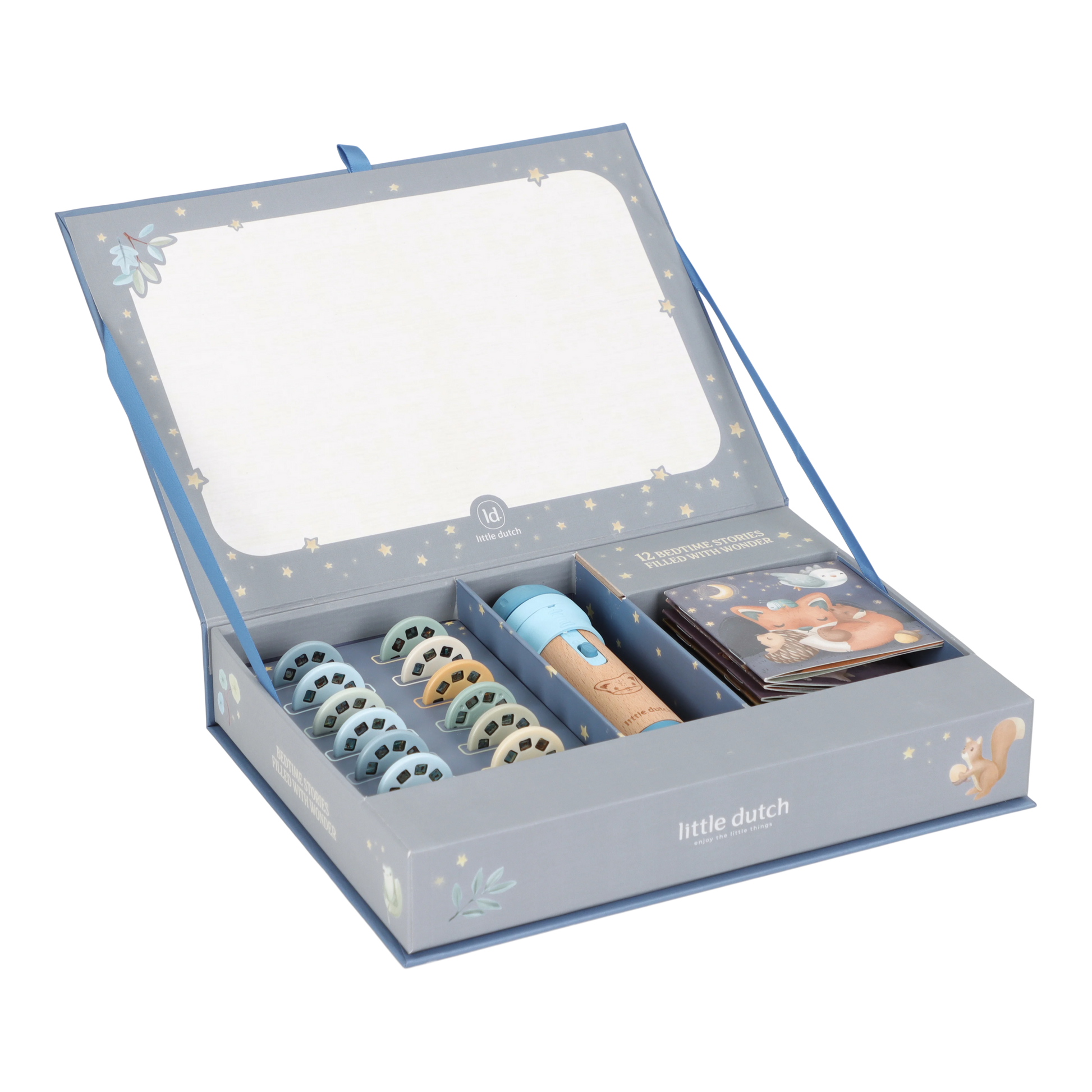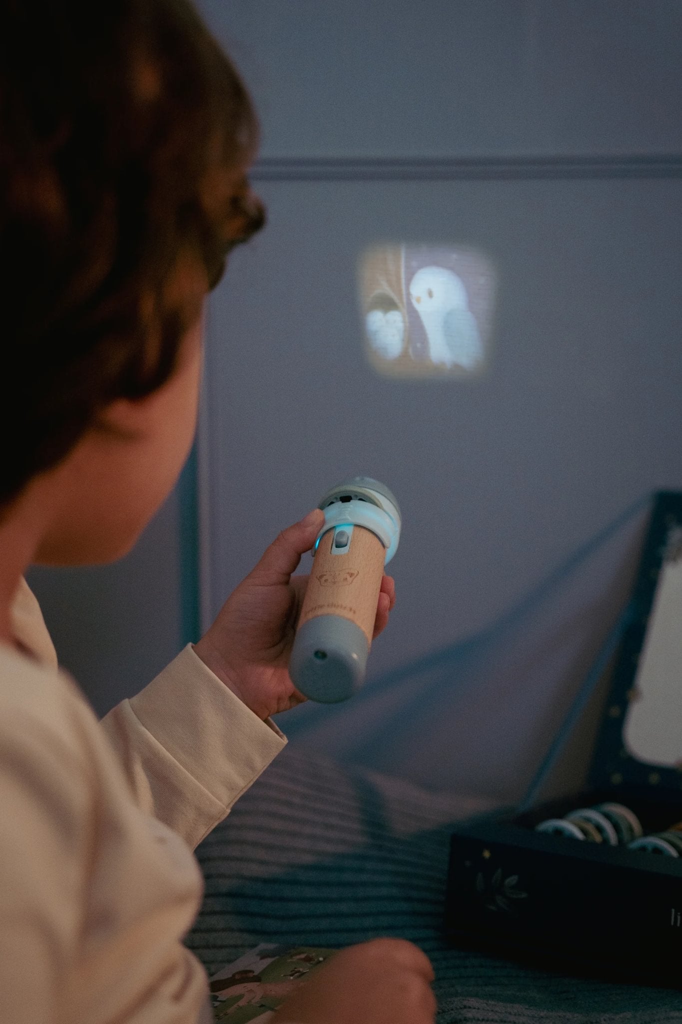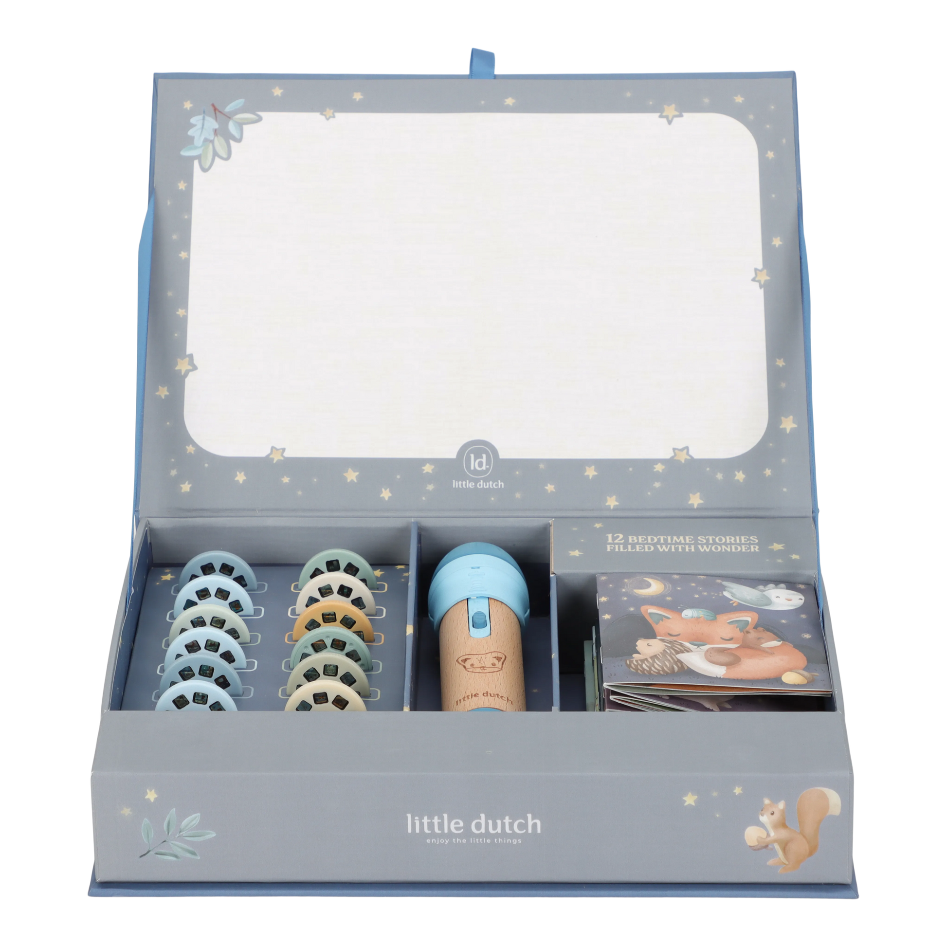 The projector torch has a sturdy wooden handle and is battery-operated, so it can go anywhere. After the story, simply store the torch and all accessories in the pretty storage box. Perfect for children who love discovering and experiencing stories.