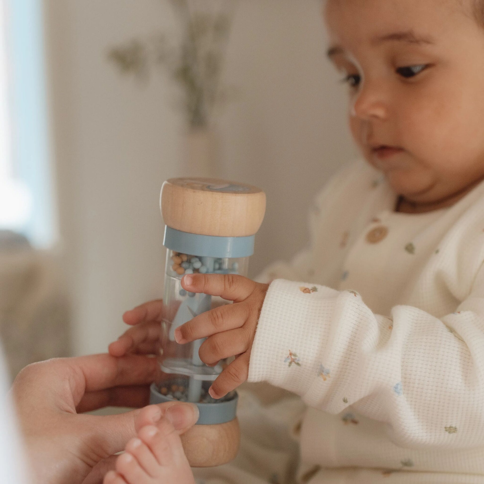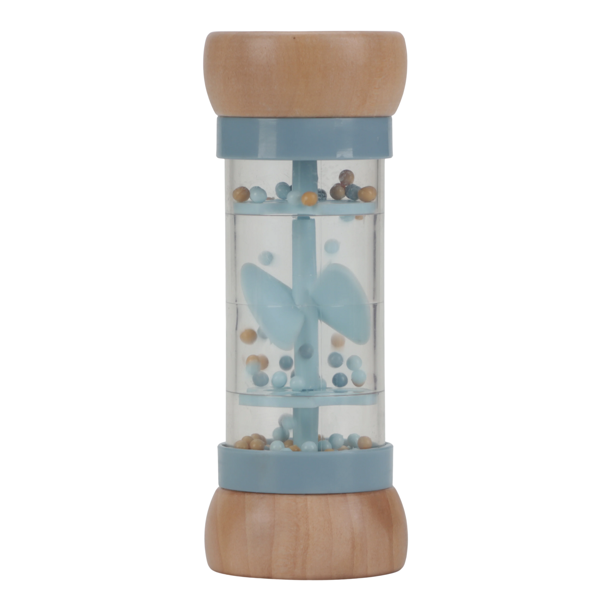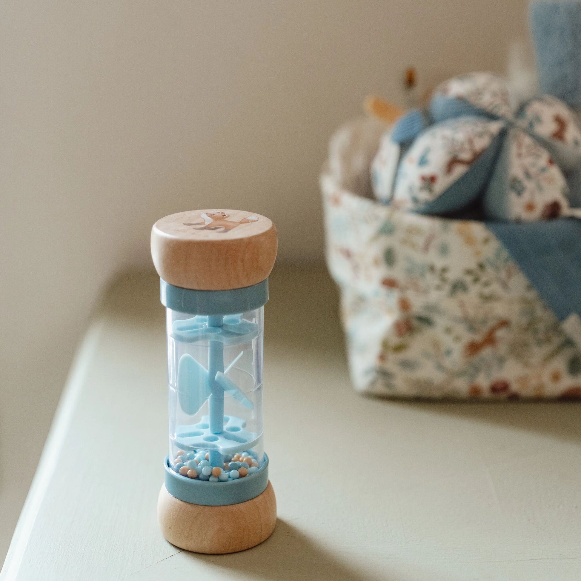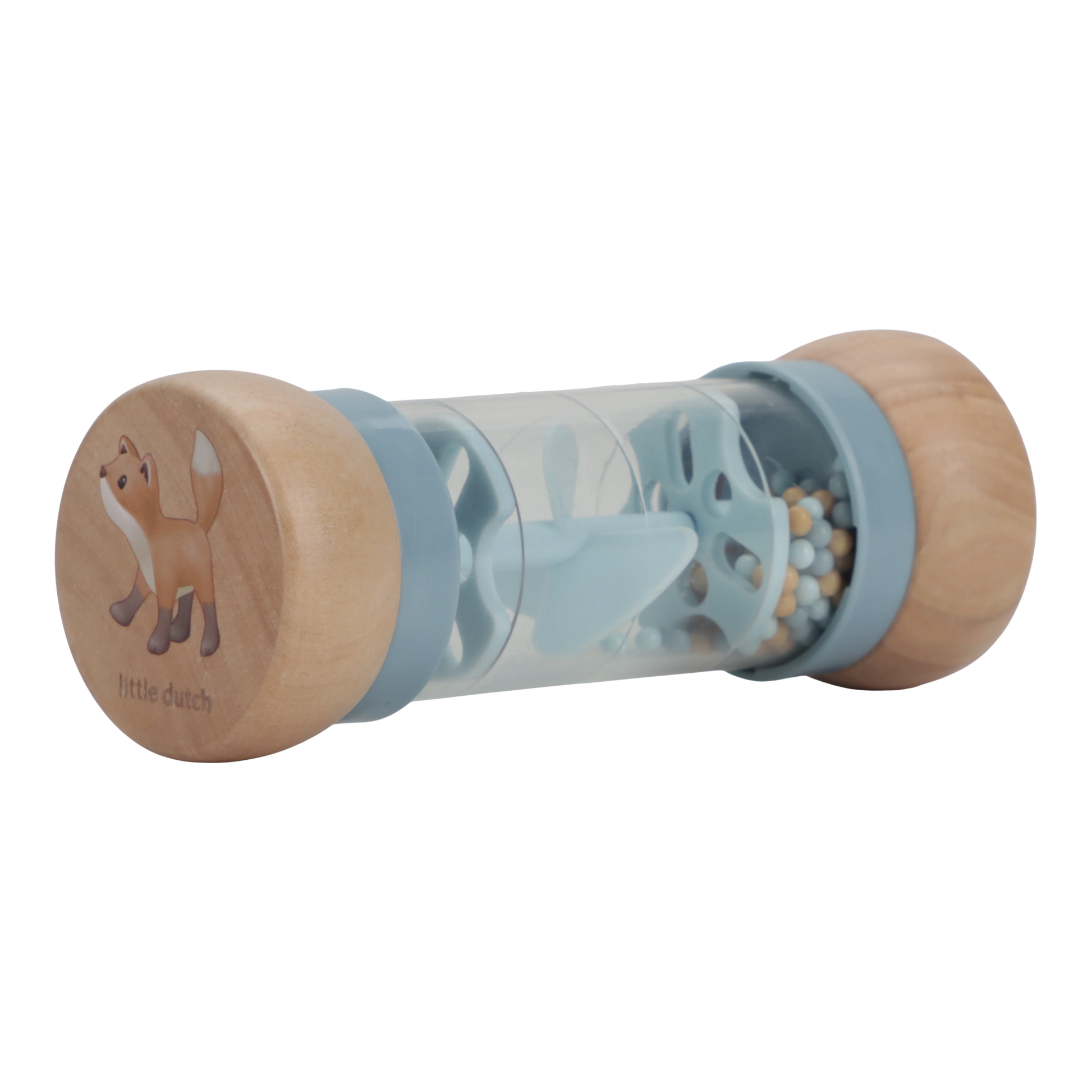 Shake and rattle! Turn the rain rattle and listen to the soothing sound of the balls moving from one side of the rainmaker to the other. It stimulates the sensory development and musical talent of your baby. The balls fall through small openings in the tube and rotate the propeller, resulting in a pleasant sound. The rain rattle is designed for little hands and is comfortable to hold. The wooden top and bottom are decorated with an illustration of a little fox and a pair of mushrooms from the Forest Friends collection.
