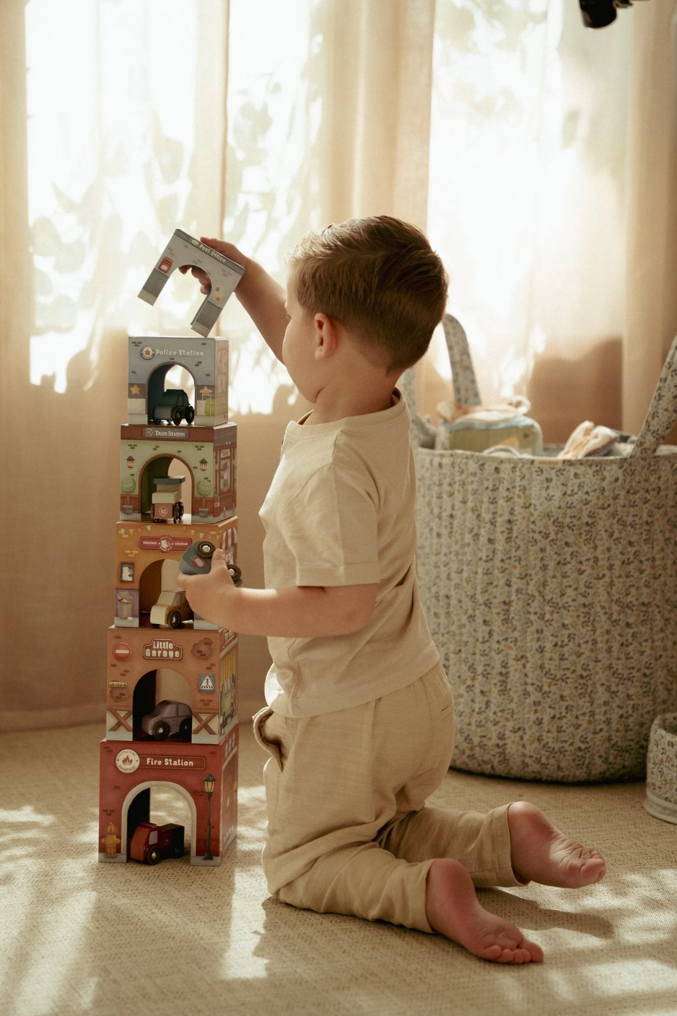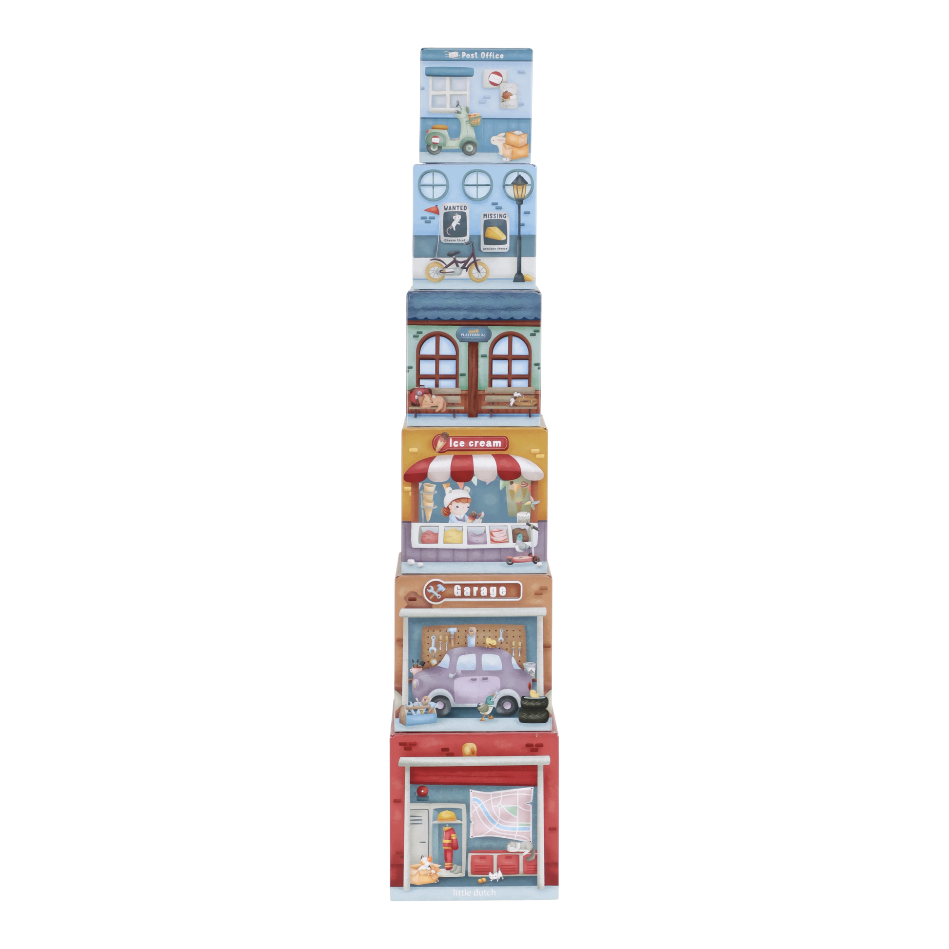 Stack, build, and explore! This set of 6 illustrated cardboard blocks with matching vehicles offers endless playtime fun. Stack the blocks on top of each other or place them over the Little Dutch Railway XL, allowing the vehicles to drive underneath effortlessly. Each block has unique illustrations and its own vehicle that fits perfectly. A playful way to stimulate imagination and motor skills!