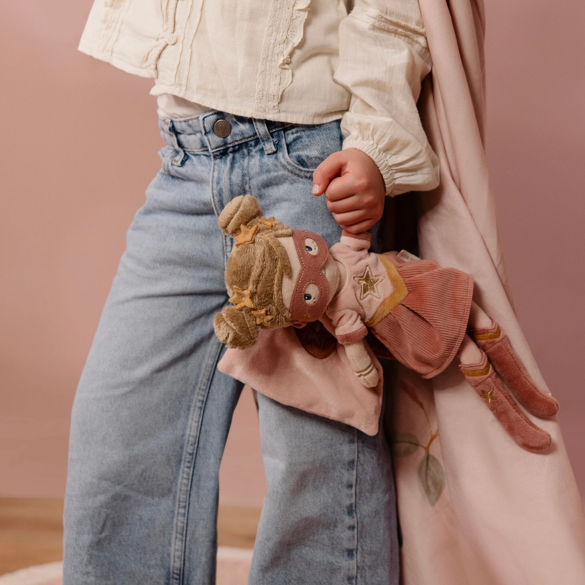 Meet cuddle doll Superhero Rosa, a soft friend with cool boots, a sparkling mask, and a cape full of golden details. Her sweet face and playful buns invite endless cuddles and imaginative play. Perfect for sharing adventures and dreaming together, every single day.