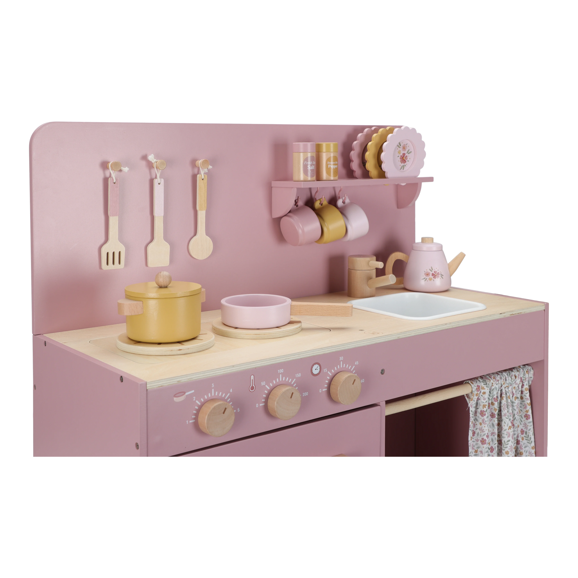 "Little chefs, get ready! With this wooden pink play kitchen, you can dive into the world of cooking and baking. The set includes two pans, kitchen utensils, three cups, and three plates, all with cheerful illustrations. Bake a cake in the oven or cook vegetables on the stove, which makes a bubbling sound when you place a pan on it. Wash your hands in the sink and store your groceries in the cupboard. The microwave has real buttons with illustrations, and with the salt and pepper set, you can add extra flavor to every dish. The fabric curtain, tea towel, and oven mitt are decorated with the soft Soft Flowers print. A charming play kitchen for endless cooking fun!"