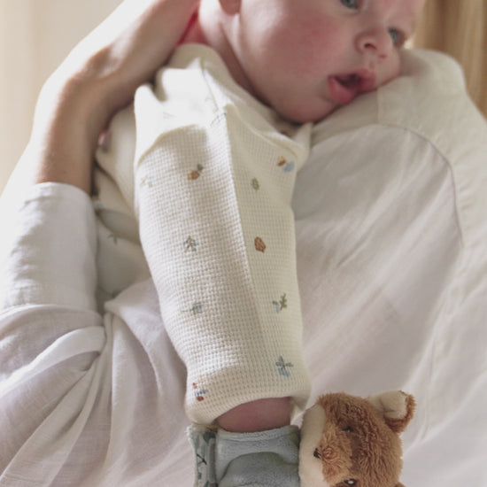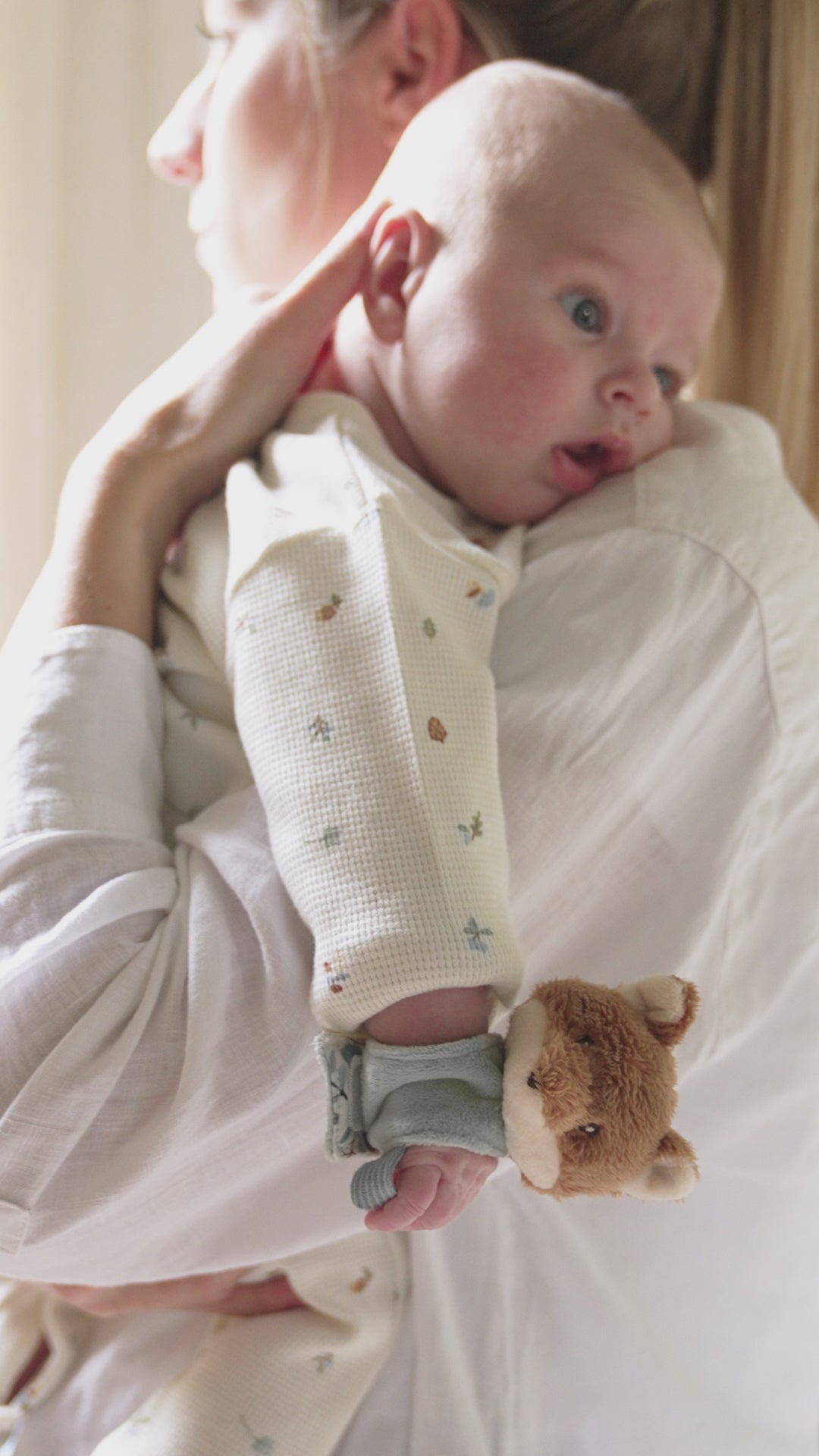Wave your hands and be amazed! This soft rattle bracelet will get your baby excited. Simply slip it onto your little one’s wrist and let the rattling fun begin. The cuddly fox on top of the bracelet is ready to move! But there is more to explore. Crinkly parts, labels and a little knot encourage grasping and touching. A wonderful toy for a happy baby.