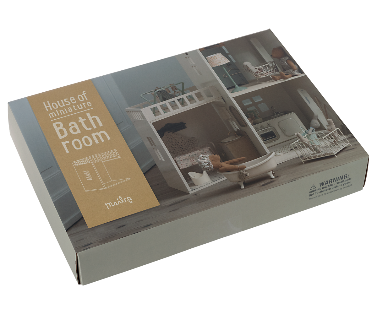 The Maileg Miniature Bathroom comes with a nicely decorated floor. In the box, you will find two small curtains that will keep your Maileg friends private.