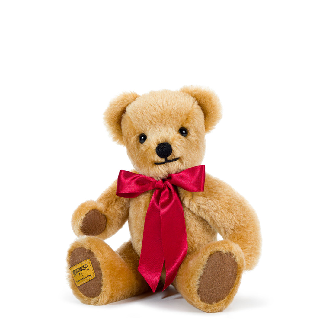 London Gold is an iconic Merrythought character, and the ultimate first teddy bear to treasure for a lifetime. Expertly hand-crafted from velvety soft golden mohair plush, with milk chocolate wool felt paws, this bear is a true classic. A simple scarlet satin bow is the perfect accompaniment.