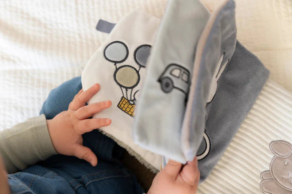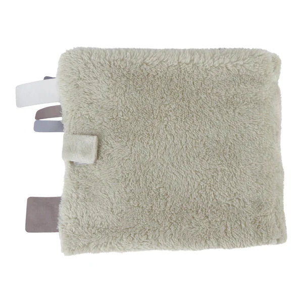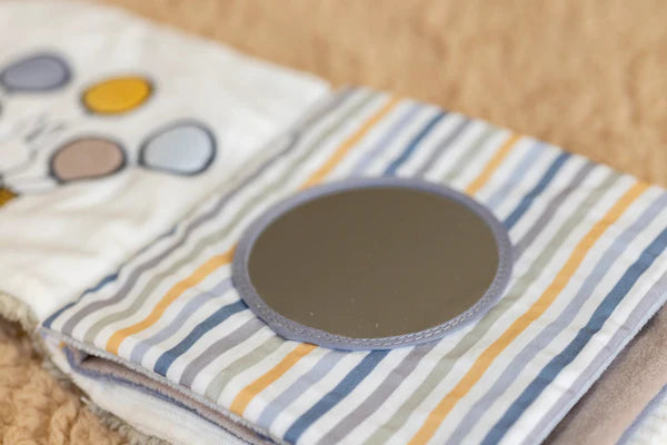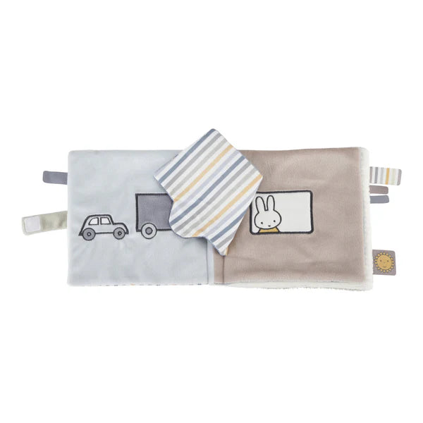 This cheerful Miffy book is full of surprises! The booklet is easy to hold and is extra soft due to the fluffy fabric on the cover. There are many activities to discover such as crisp paper, a mirror, a flap and labels to feel. Different types of fabric have been used. There is a small loop on the booklet to attach it to something.