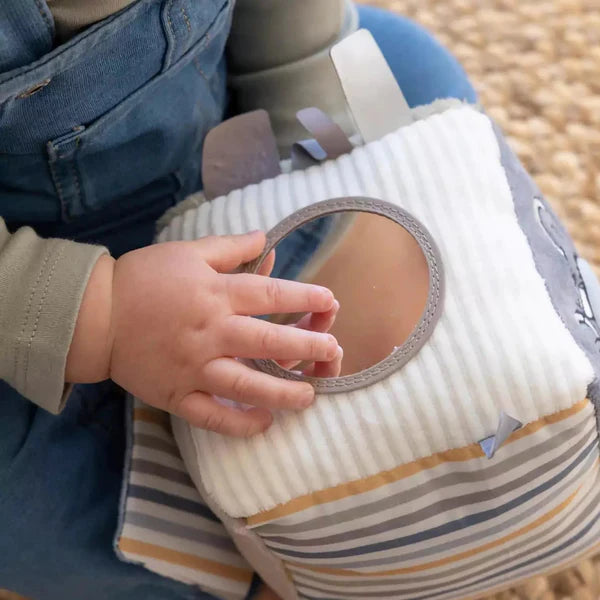 Your child will not get bored easily with this fun Miffy activity cube. There is something different to discover on each side of the cube, such as fun images, different fabrics, labels to feel, and a mirror. There is also a bell inside the cube for a nice rattle effect.