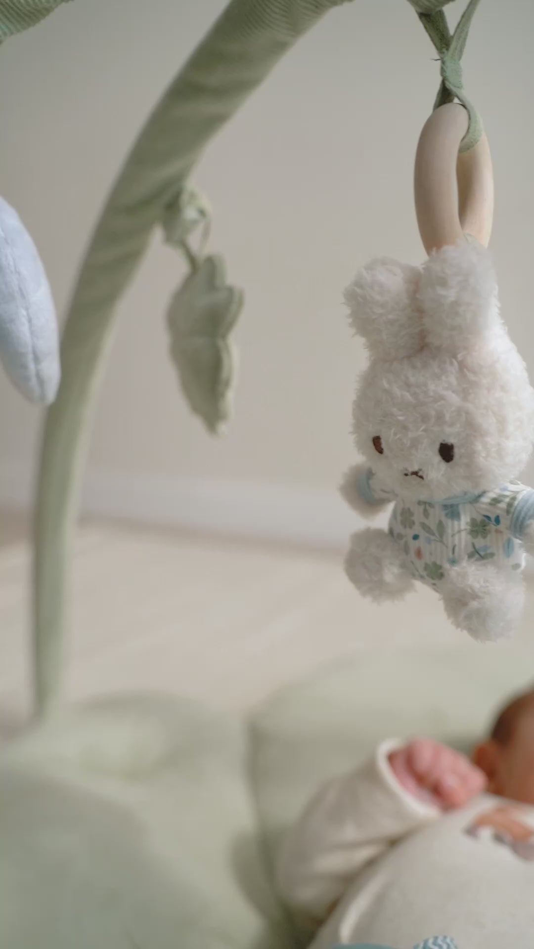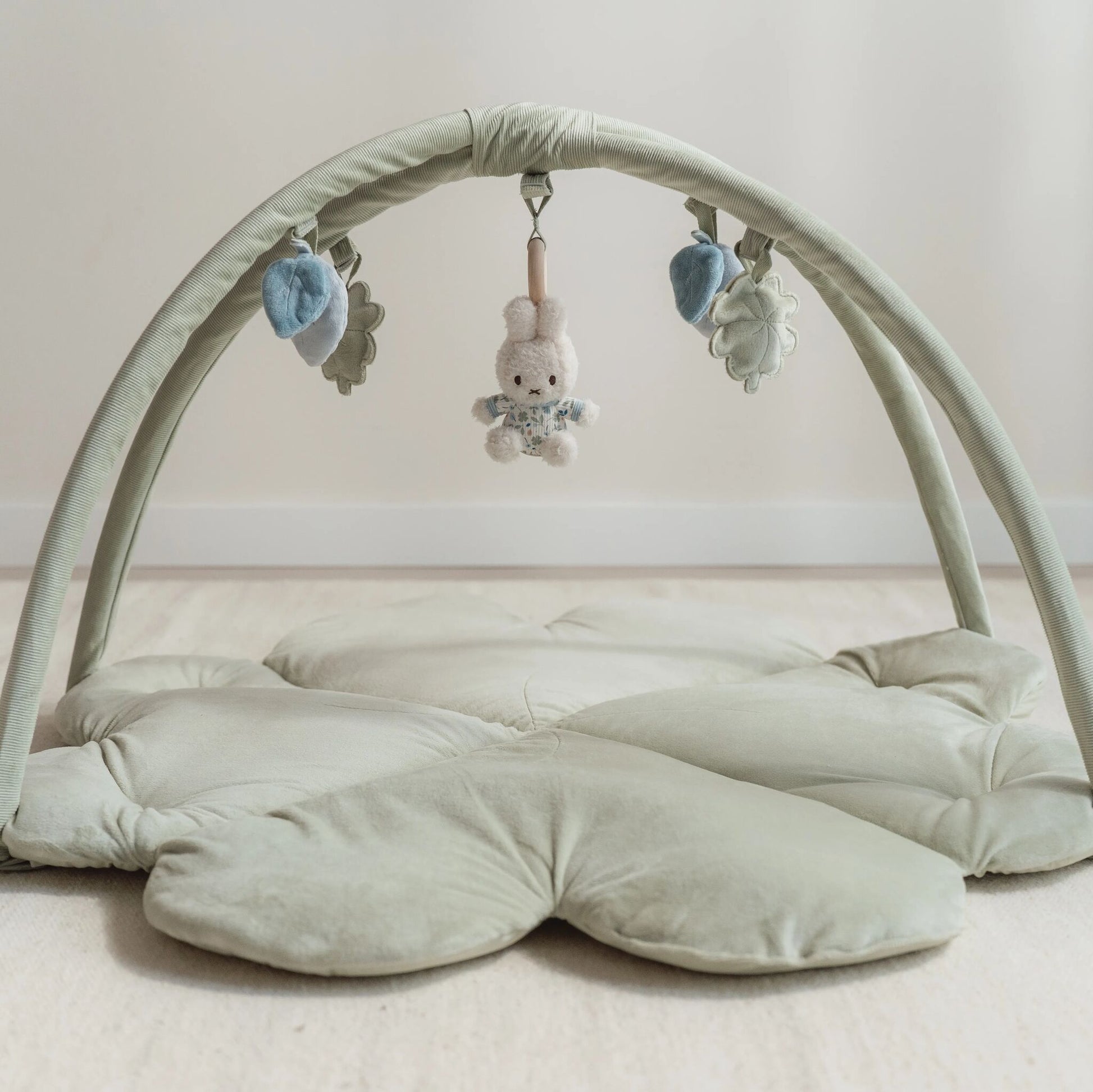So much to see, feel, and hear! Every day is a new adventure with this clover-shaped play mat. The mat has two large corduroy arches where five different plush toys in the Lucky Leaves theme hang. miffy, two four-leaf clovers, and two leaves help your child develop sensory skills and stimulate hand-eye coordination.